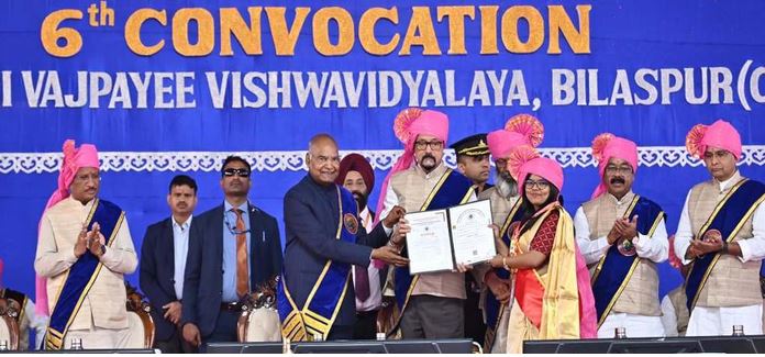 रायपुर, अटल बिहारी वाजपेयी विश्वविद्यालय के छठवें दीक्षांत समारोह का आयोजन आज पूर्व राष्ट्रपति श्री रामनाथ कोविंद के मुख्य आतिथ्य में गरिमामय वातावरण में किया गया। कार्यक्रम की अध्यक्षता राज्यपाल श्री रमेन डेका ने की। अति विशिष्ट अतिथि के तौर पर मुख्यमंत्री श्री विष्णु देव साय, विशिष्ट अतिथि उपमुख्यमंत्री श्री अरुण साव तथा उच्च शिक्षा मंत्री श्री टंकराम वर्मा शामिल हुए। कार्यक्रम में विश्वविद्यालय के कुलपति आचार्य डॉ. दिवाकर नाथ वाजपेयी उपस्थित रहे। समारोह में 64 शोद्यार्थियों को शोध उपाधि, 92 गोल्ड मेडल एवं 36950 स्नातक एवं स्नातकोत्तर उपाधि दी गई।