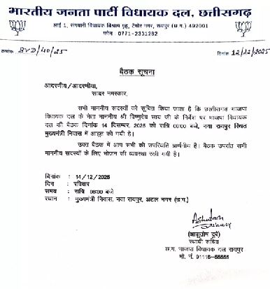 Report by manisha yadav रायपुर। भाजपा विधायक दल की बैठक कल होगी। रात 8 बजे नया रायपुर स्थित मुख्यमंत्री निवास में बैठक रखी गई है, शीतकालीन सत्र की तैयारियों पर चर्चा होगी। बैठक सूचना पत्र में लिखा है कि सादर नमस्कार, सभी माननीय सदस्यों को सूचित किया जाता है कि छत्तीसगढ़ भाजपा विधायक दल के…