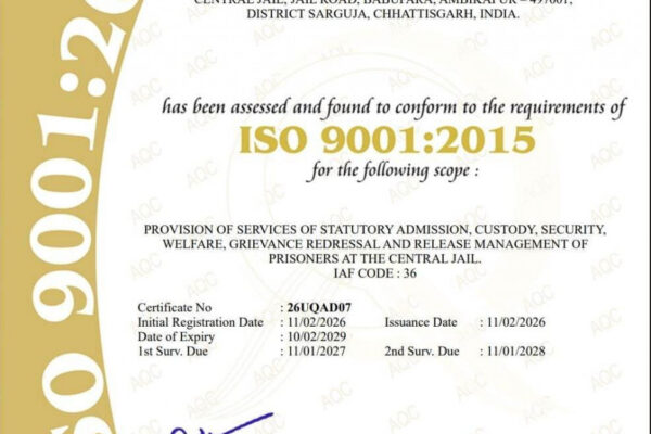 छत्तीसगढ़ की 4 सेंट्रल जेलों को आईएसओ गुणवत्ता प्रमाणन से मिली पहचान